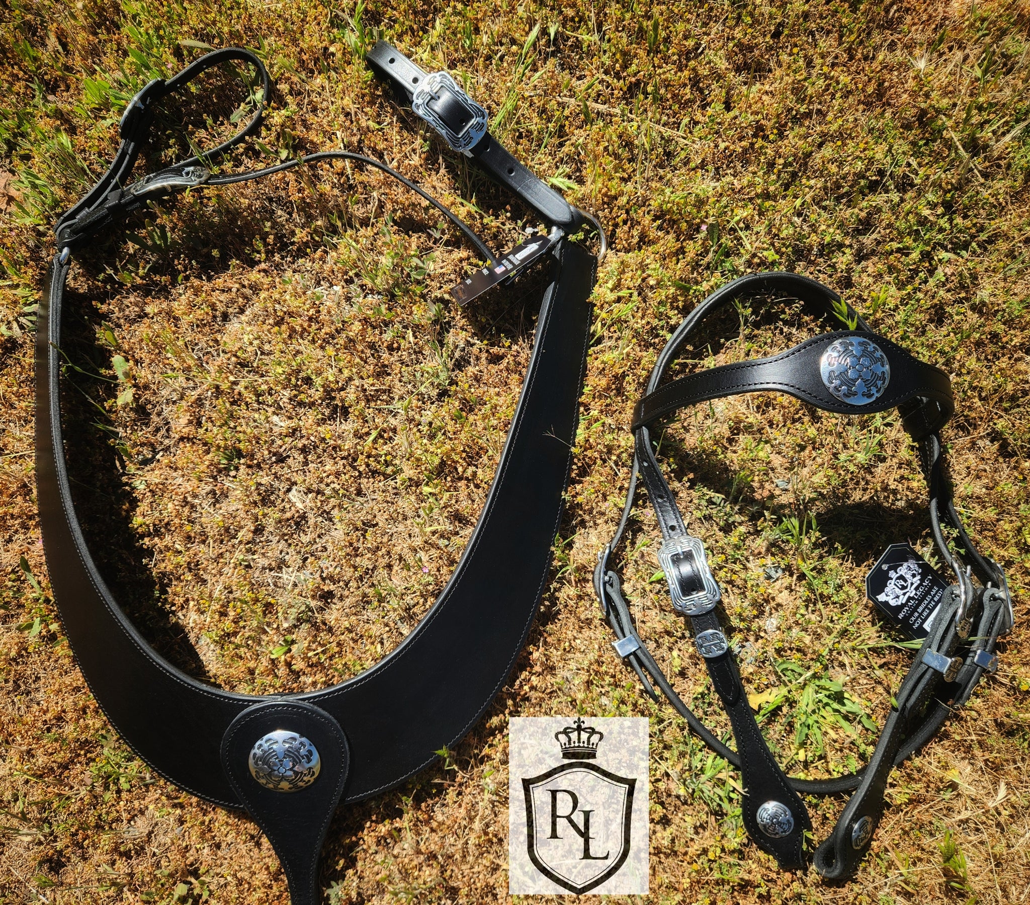 The Dark Horizon bridle and breast collar set pairs bold black leather with shining stainless steel hardware for a timeless western look.