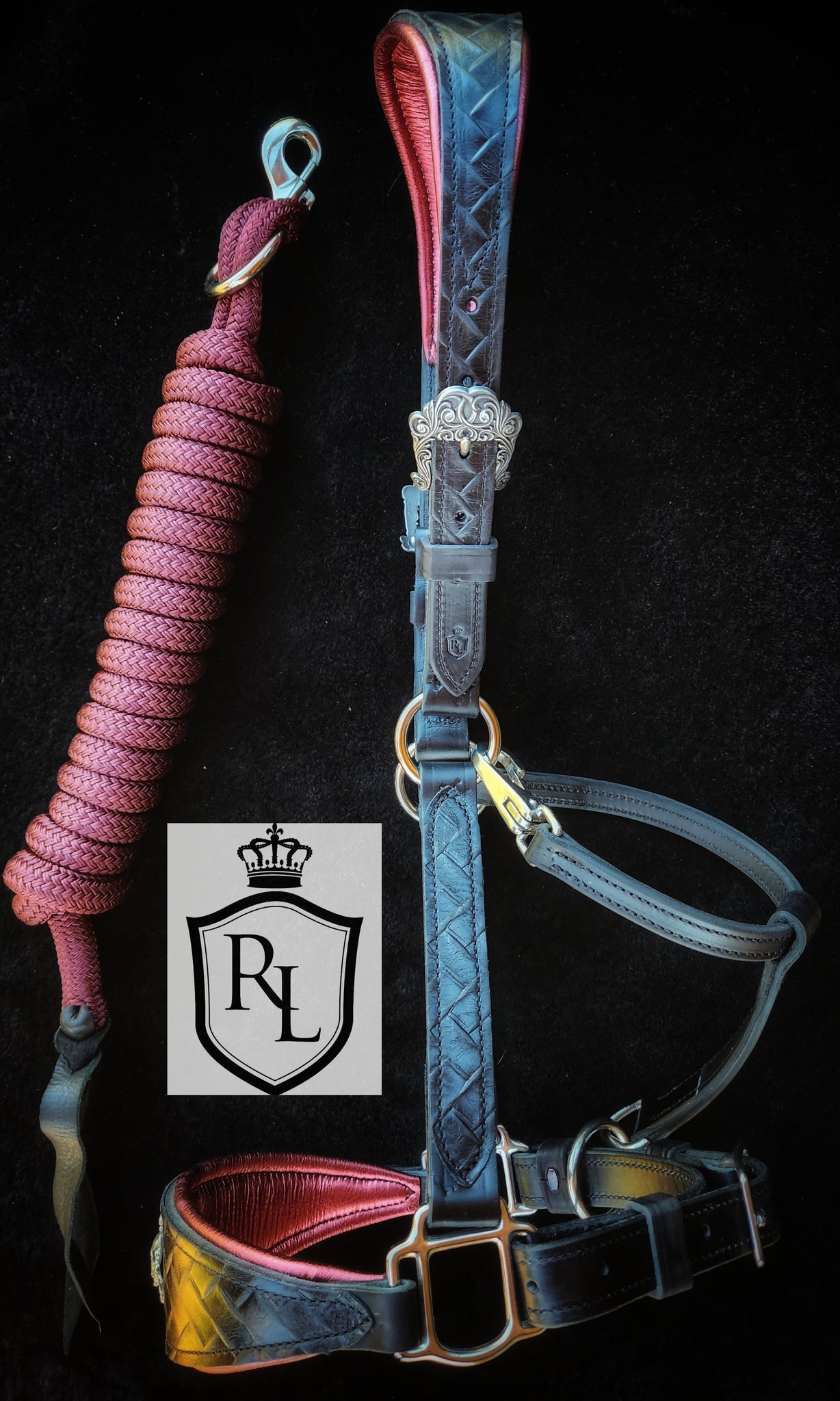 Beautiful, padded halter in black embossed leather with burgundy padding and a beautiful Handmade Victorian skull concho.